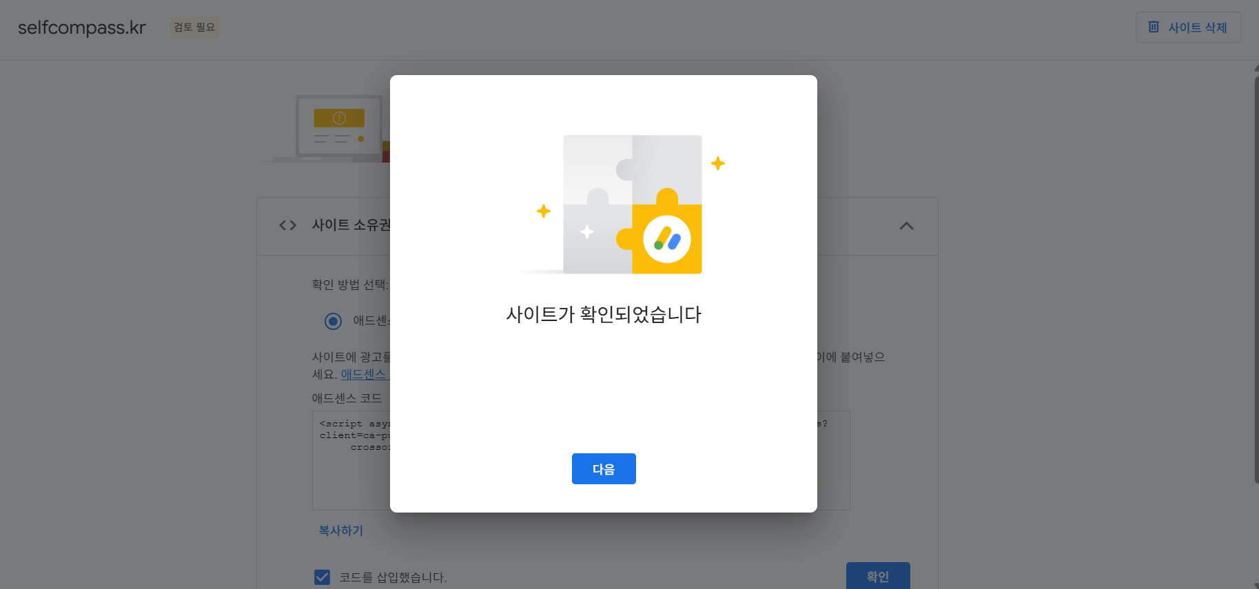 사이트 확인 성공했습니다.(구글이 이 코드가 있는 사이트가 내 것임을 확인했습니다)