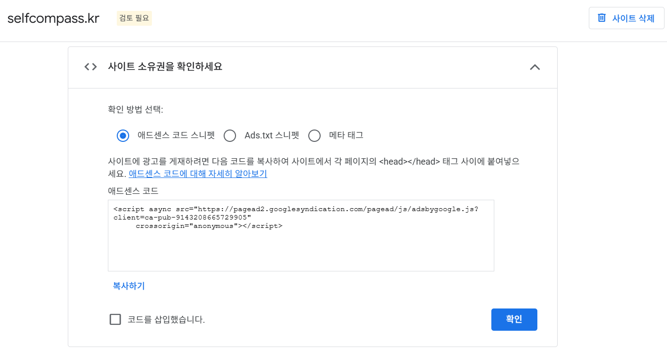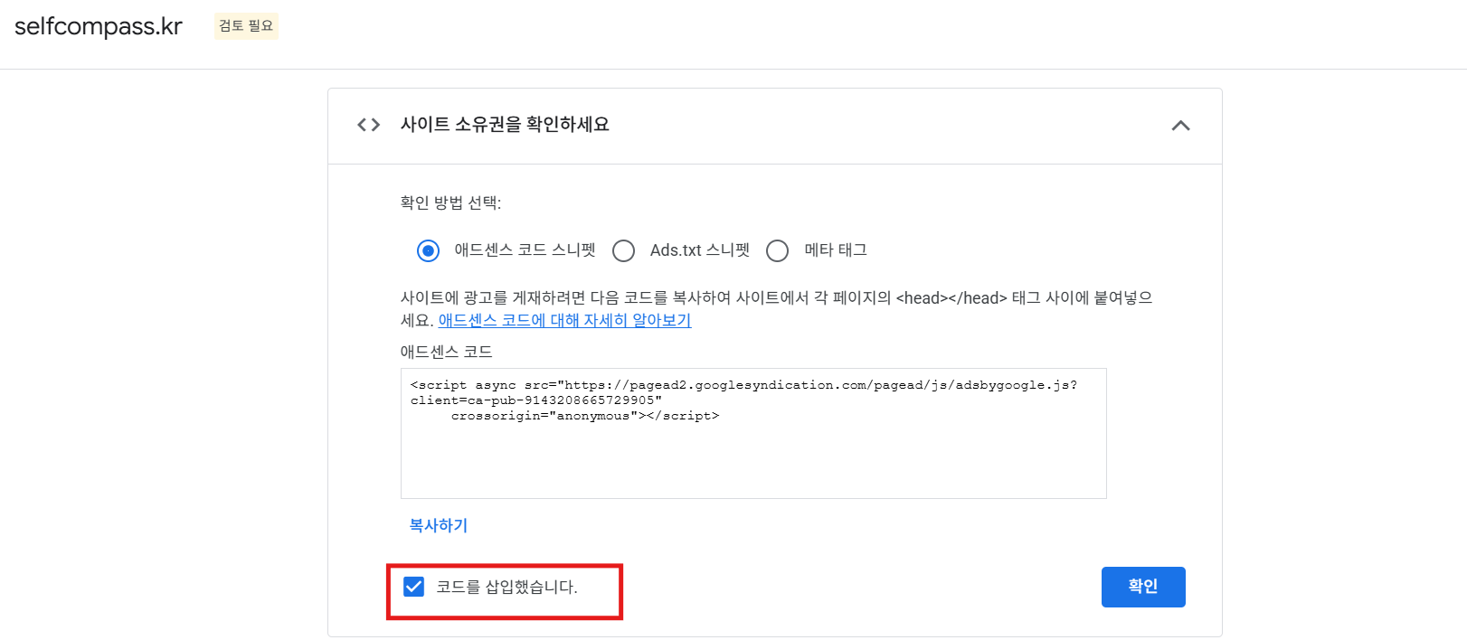 다시 구글 애드센스로 가서 '코드를 삽입했습니다'를 체크하고 확인버튼을 누릅니다.