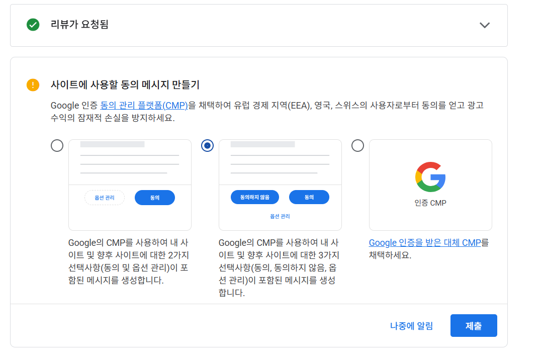 마지막으로 유럽 관련해서 광고가 오는 경우 '동의하지 않음'을 넣어야 하는데 이를 준수할지를 묻는 질문입니다. 유럽에서 제 사이트를 들어올 일이 없기 때문에 가장 안정적인 2번째 항목을 선택했습니다.