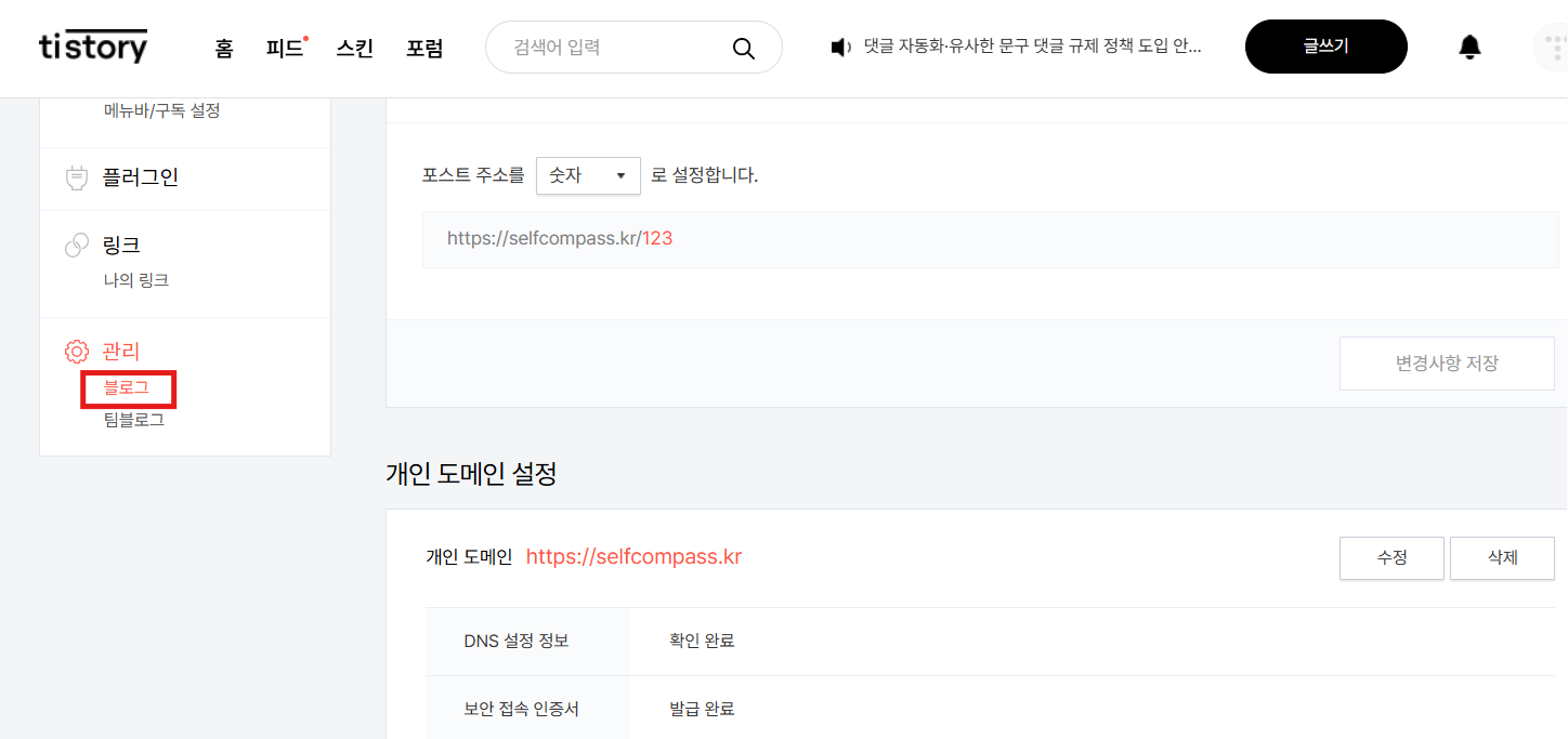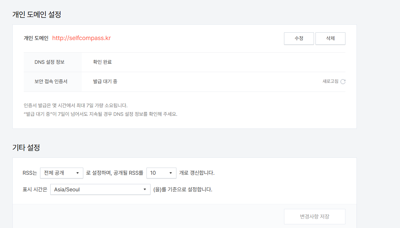 여기서 내가 등록한 개인도메인을 등록합니다. 바로 하면 보안접속 인증서(https)이 발급 대기 중인데 저는 1~2시간 지나자 발급 완료가 되었습니다.
