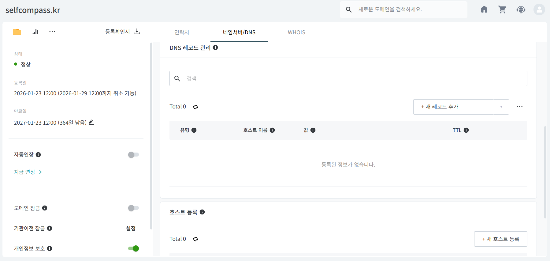 호스팅케이알에서 도메인 -> 네임서버/DNS -> DNS 레코드관리에 들어갑니다.