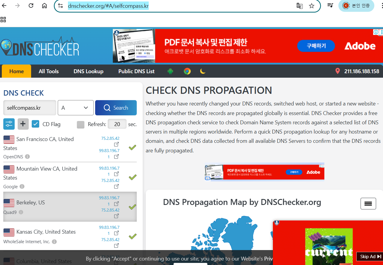 몇 시간 지나서 https://dnschecker.org 에서 체크해보니 dns서버에 제대로 배포가 되었습니다.