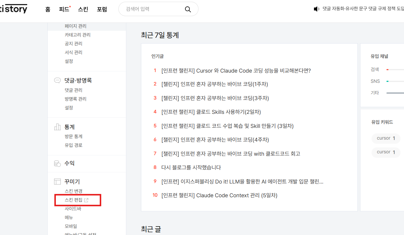 티스토리 설정화면에서 '스킨편집'에 들어갑니다.
