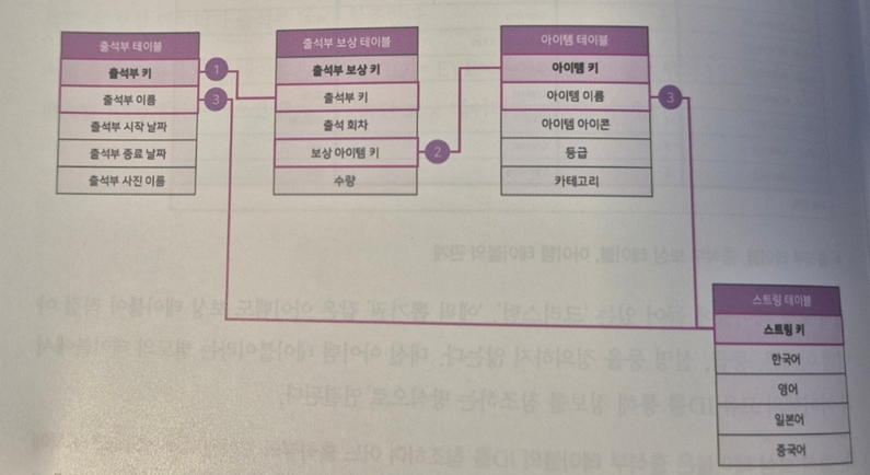 관계형 DB의 정규화하는 과정과 유사하게 게임 데이터를 효율적으로 쪼개서 각 테이블의 키를 참조하는 형태로 설계하는 것이 핵심입니다. 예를 들어 교제에는 '출석부 시스템'을 예를 들어 설명했는데, 아래 3가지 테이블로 나누어 구성하고 각각 참조하는 방식으로 설계했습니다.1. 출석부 테이블: 출석부의 이름, 기간, 사진 등 기본 정보를 담고 있음2. 출석 보상 테이블: 출석부 내 회차에 어떤 보상을 주는지 담고 있음3. 아이템 테이블: 보상으로 지급되는 아이템들의 상세 정보를 담고 있음